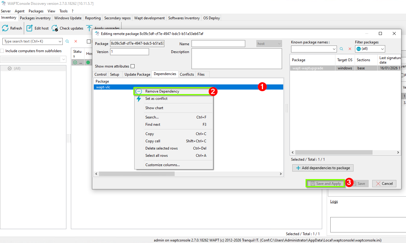 Select the package you want to remove the dependency from in the left-side list (e.g., wapt-vlc). (1)