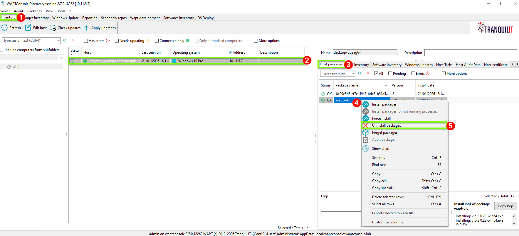 Select the machine from which you want to remove a software package (e.g., wapt-vlc). (2)